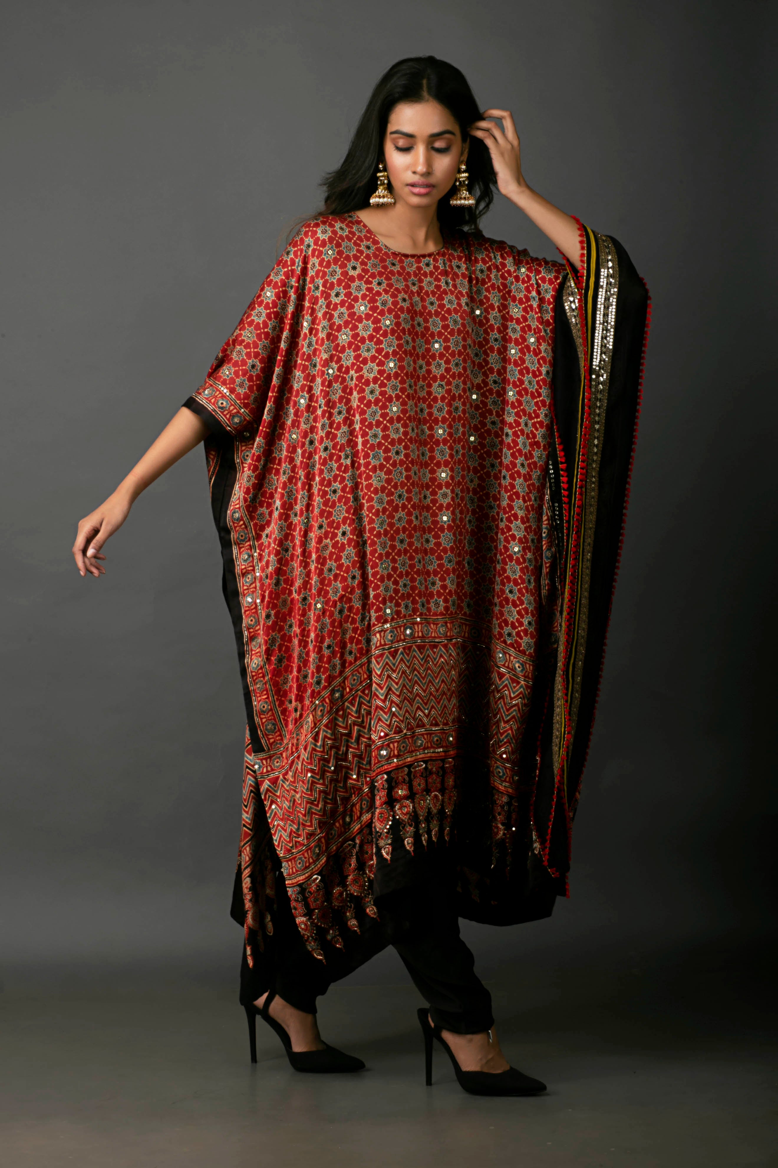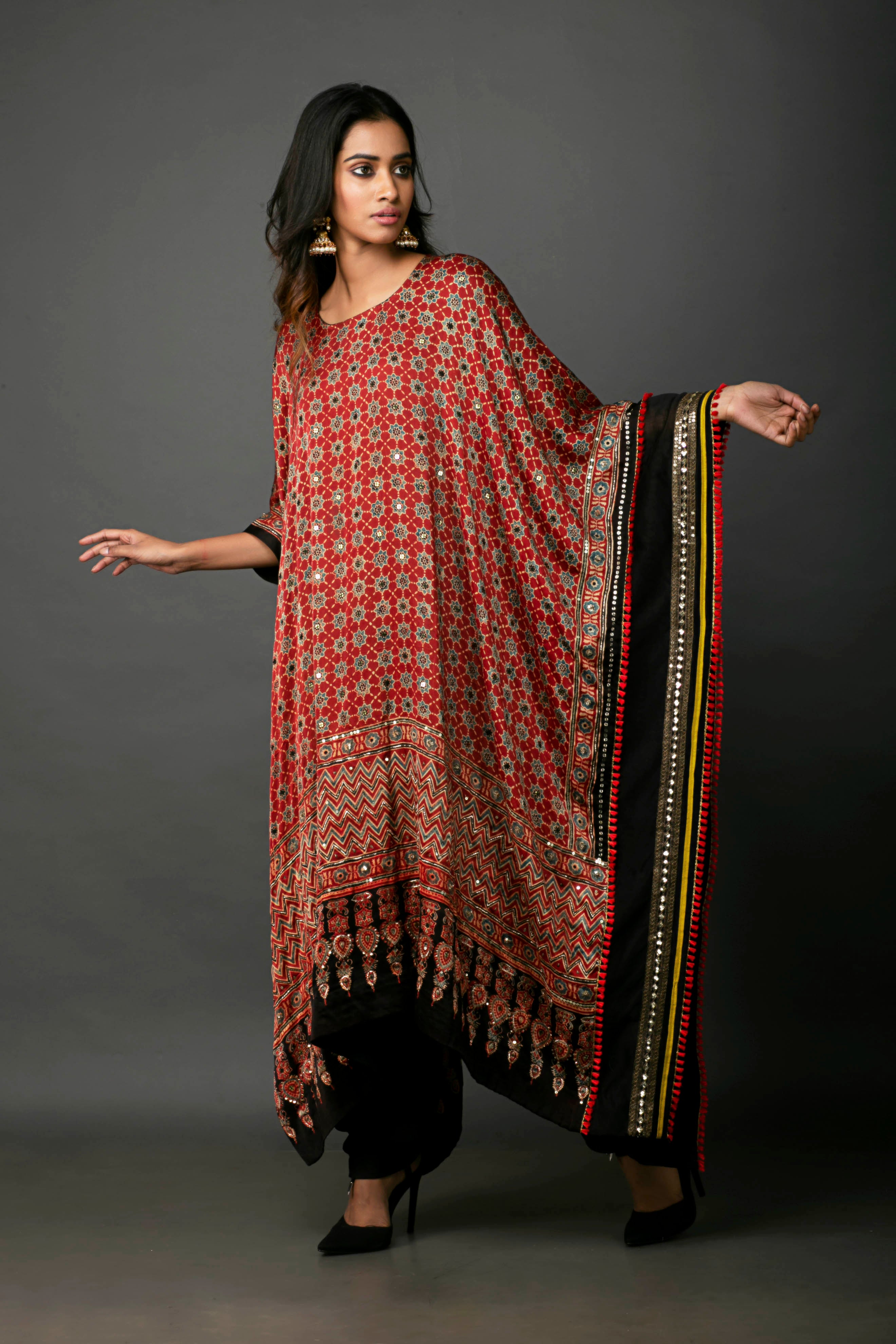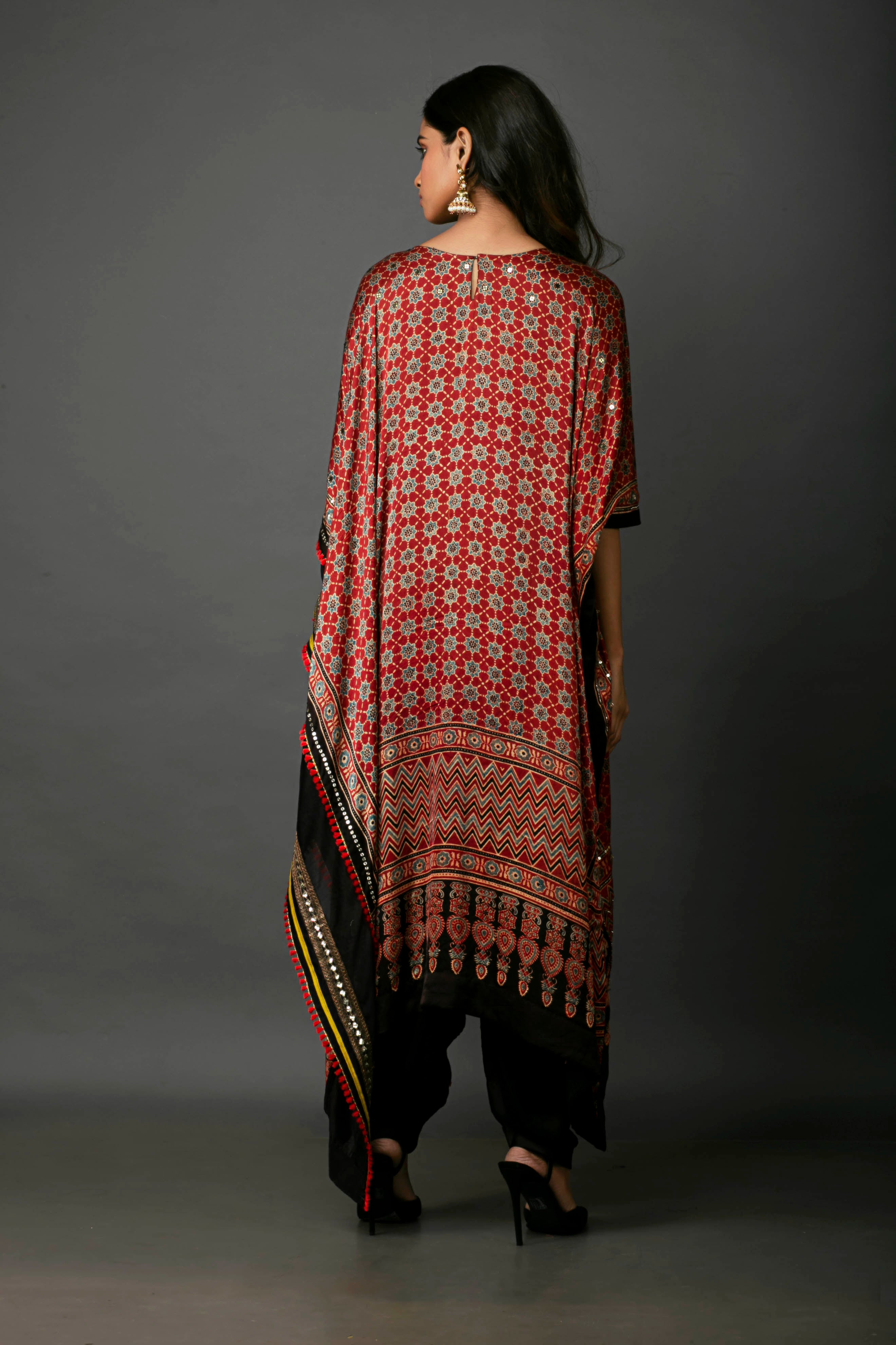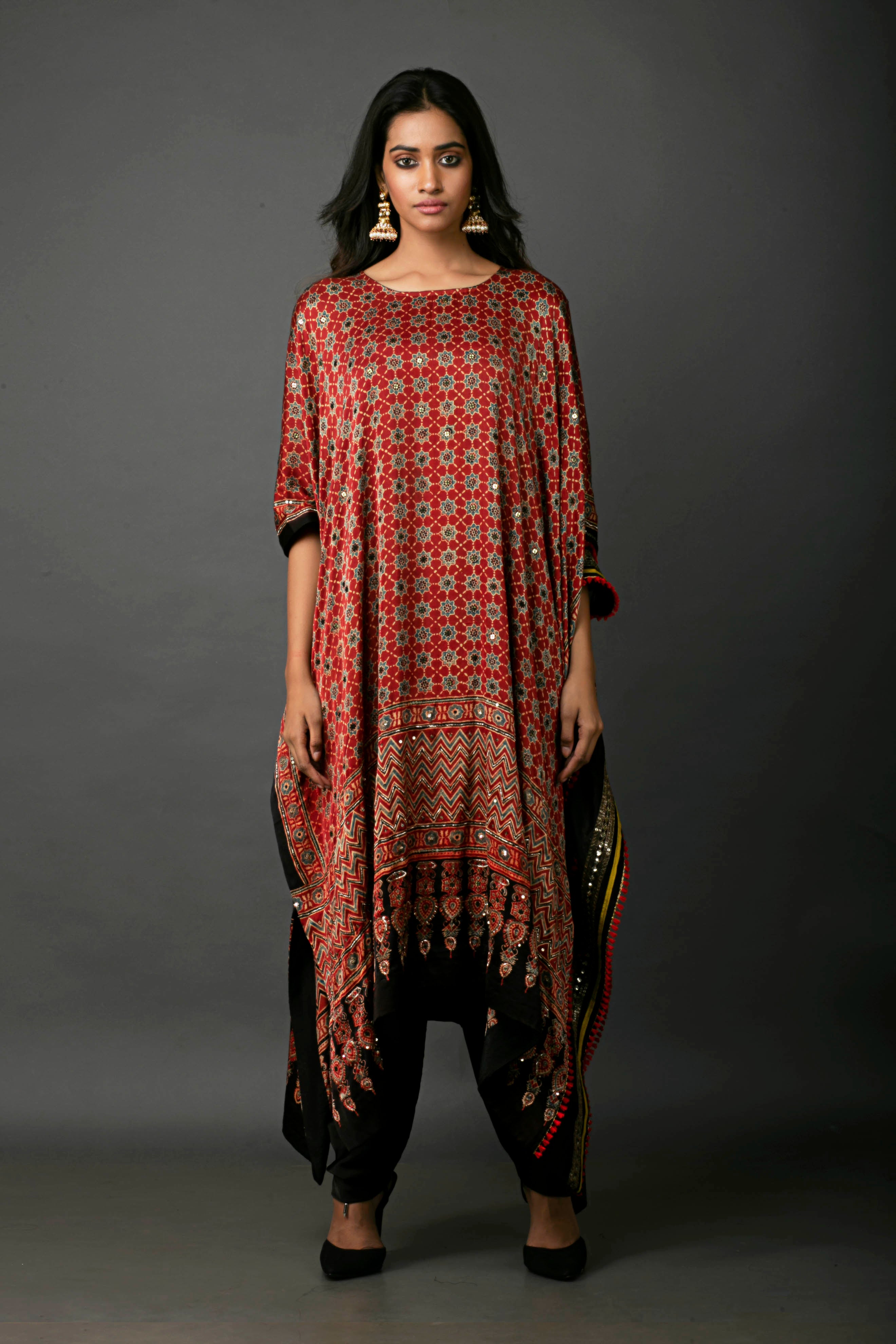 Experience the perfect blend of tradition and comfort with our embroidered satin kaftan, featuring intricate handblocked ajrakh designs. This kaftan offers a relaxed, comfort fit, ensuring easy movement. It comes with a matching salwar to complete the look. Ideal for casual and formal occasions, this set combines style and versatility.