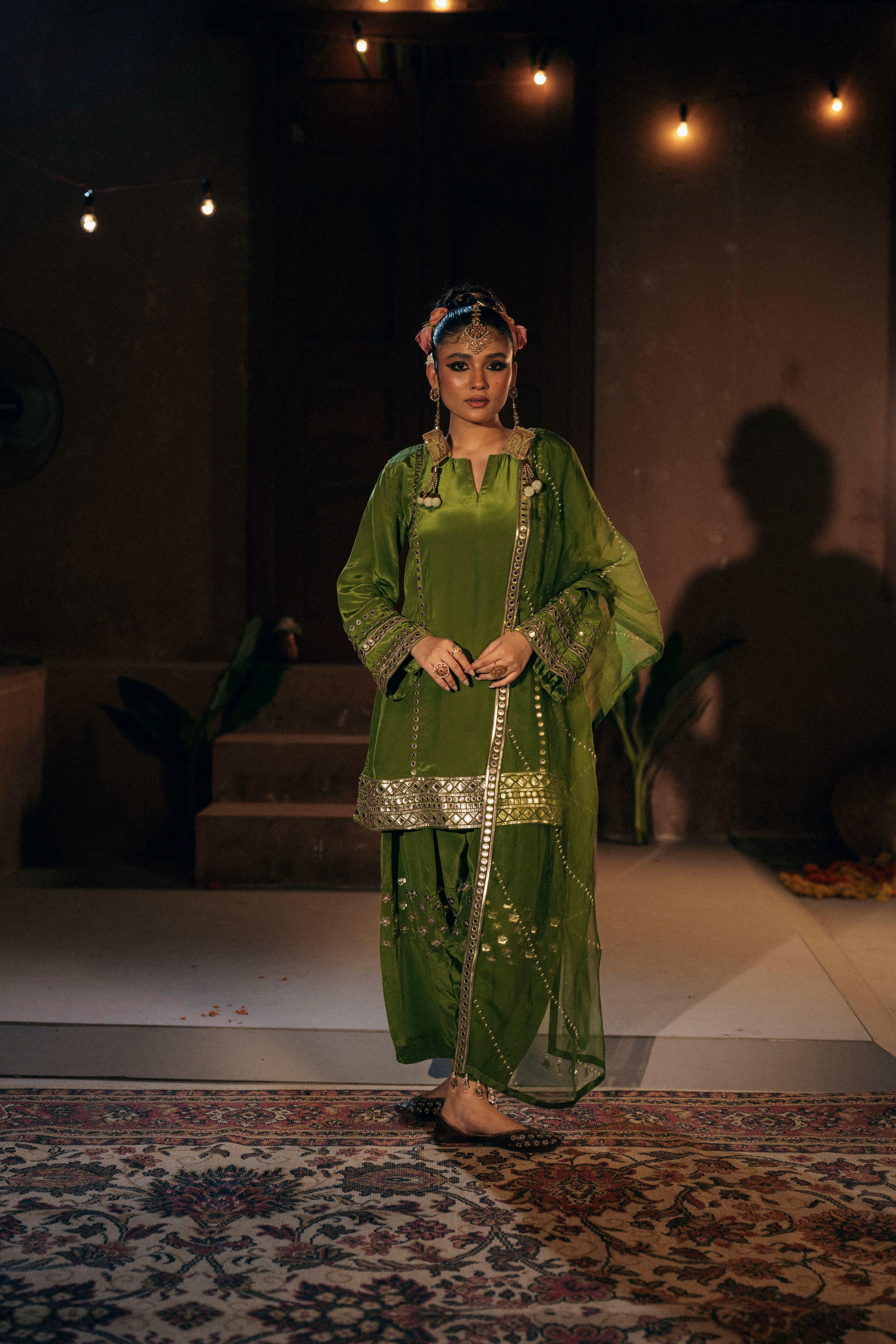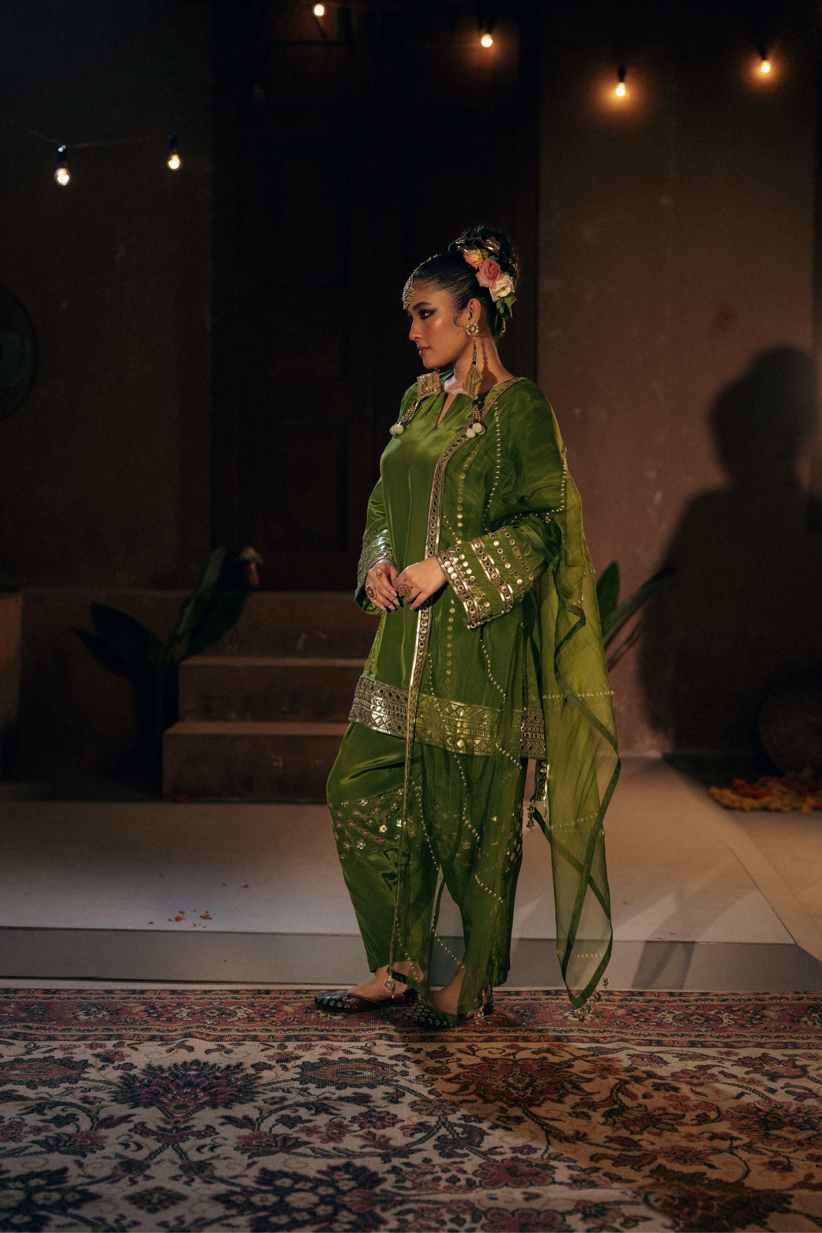 Sunira Green Toga Drape Dress with Tunic and Dhoti Skirt