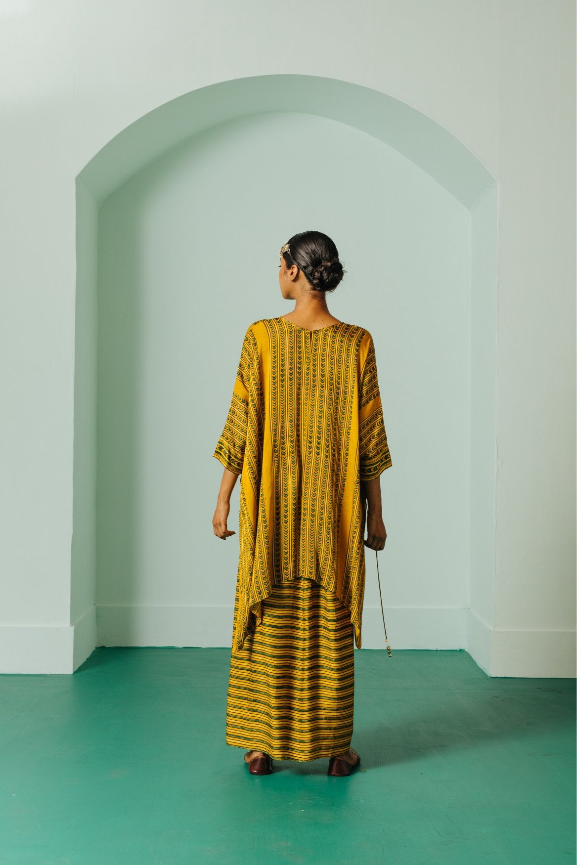 Embroidered asymmetric kaftaan tunic in pure ajrakh satin with coordinated wrap cowl skirt