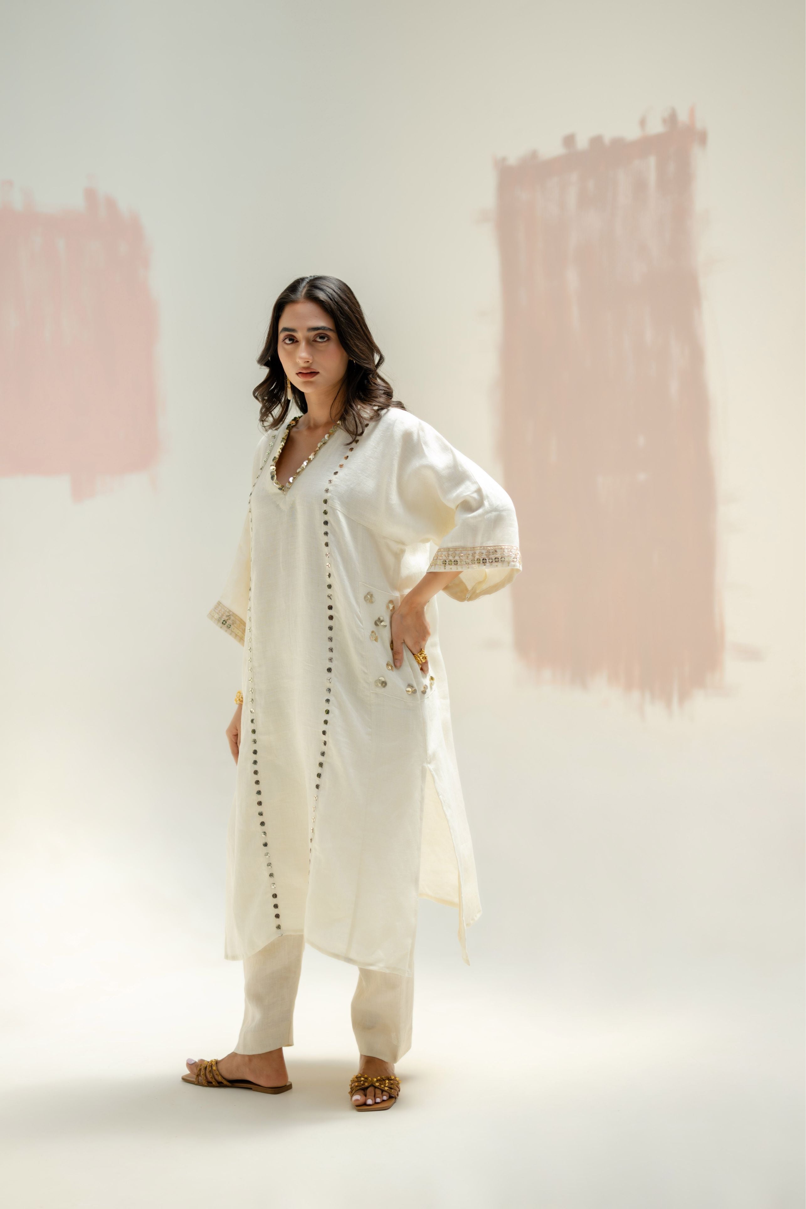 Natural White Linen Choga Kurta Set is designer’s favourite ,offering a perfect blend of style and sophistication. Featuring hand-embroidered pockets and a unique Choga silhouette the kurta is paired with slim linen pants makes it ideal for all day festivities.