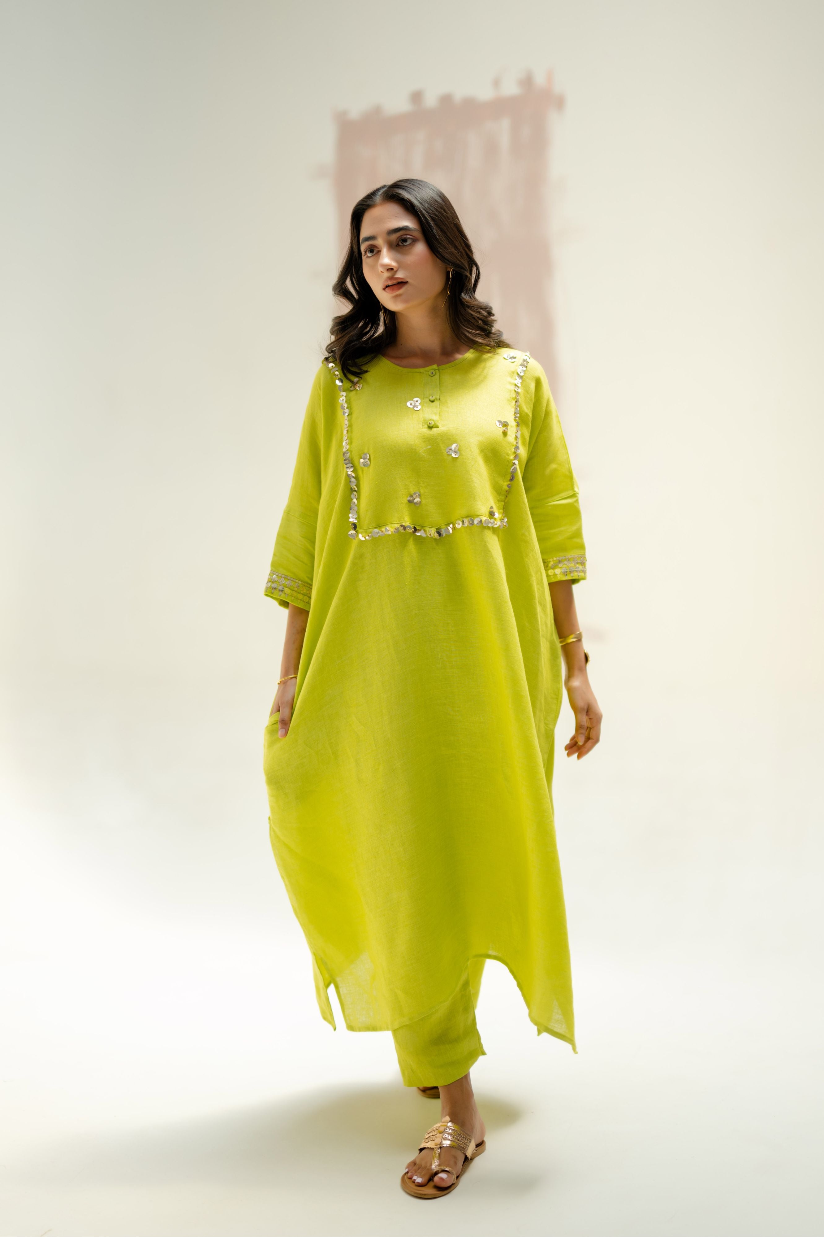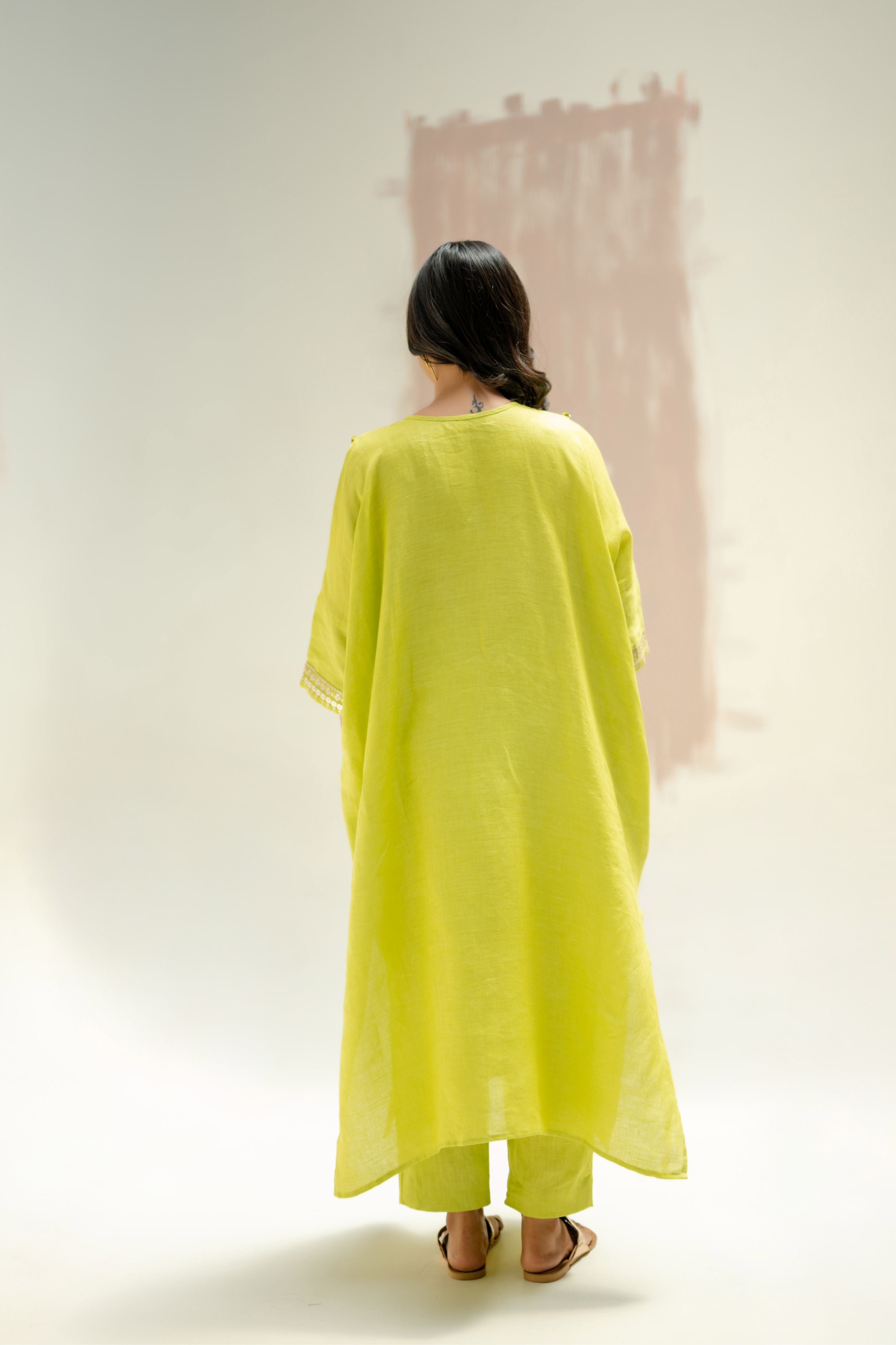 The pure linen longline kaftan kurta set has become a highly sought-after dress, known for its elegant design and comfort. The hand-embroidered yoke and wide sleeves add intricate detailing, while the slim linen pants provide a sleek, modern finish.