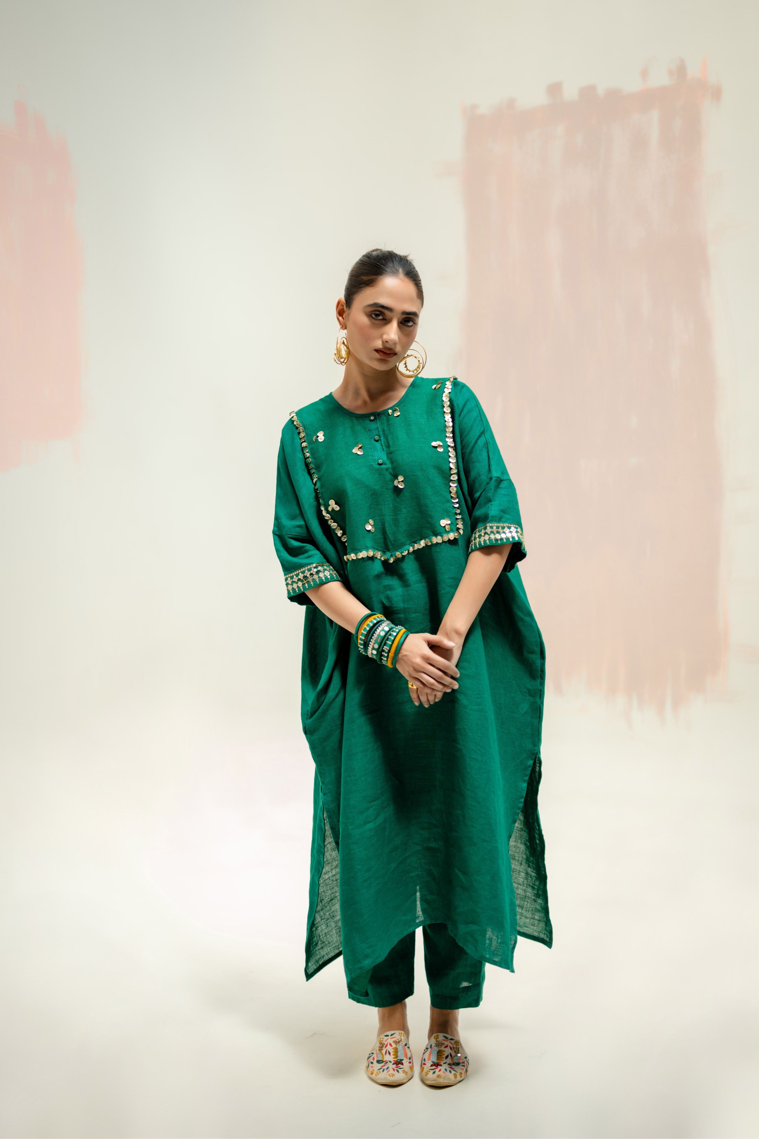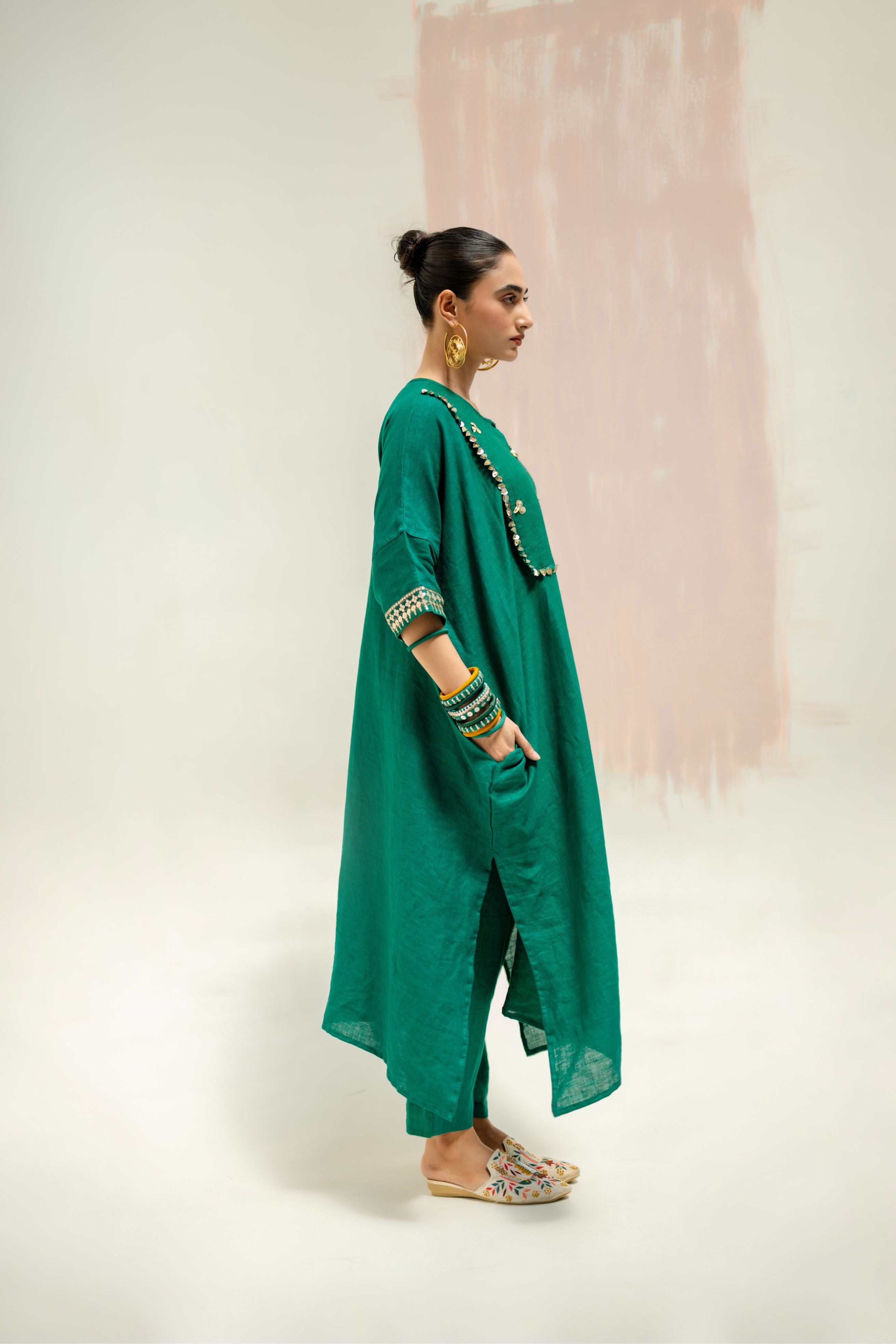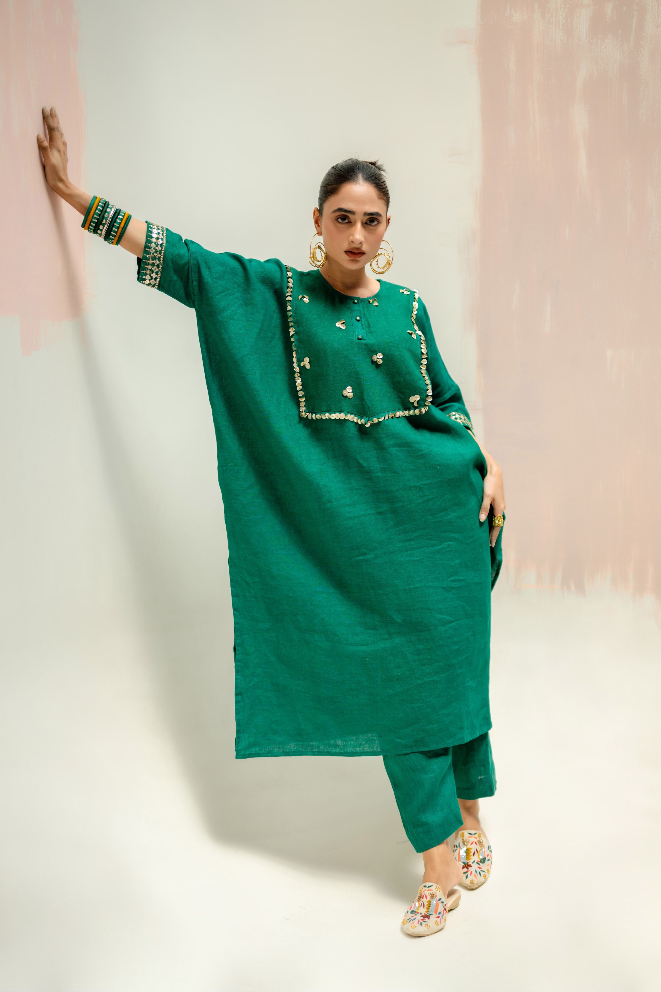 The pure linen longline kaftan kurta set has become a highly sought-after dress, known for its elegant design and comfort. The hand-embroidered yoke and wide sleeves add intricate detailing, while the slim linen pants provide a sleek, modern finish.