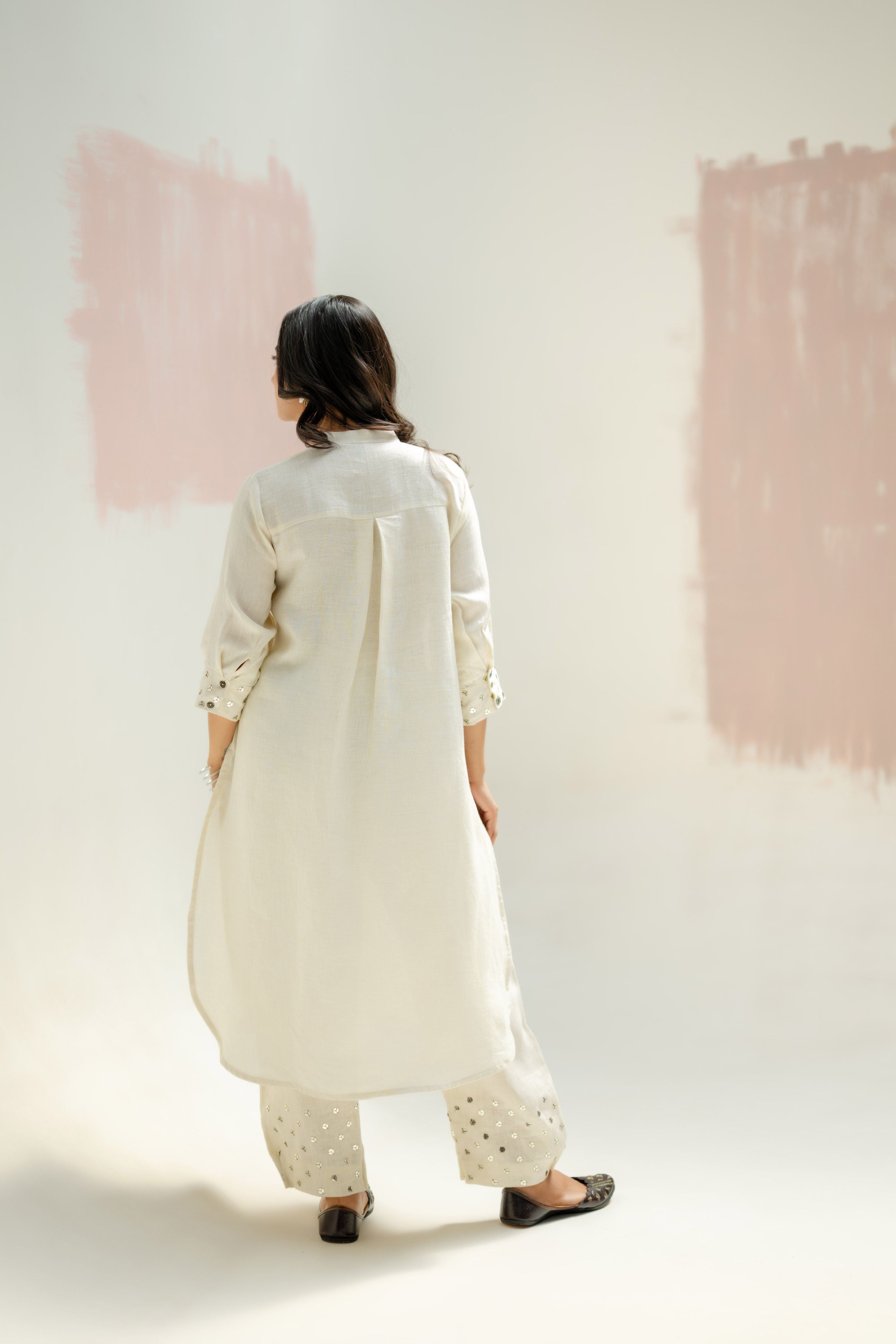 Crafted from pure linen, this kurta set features a structured yet effortless fit with a mandarin collar, making it a summer essential. The hand-embroidered cuffs, adorned with sequins and threadwork, add a subtle shimmer. Paired with comfortable linen pants, delicately embroidered and gathered at the hem for a stylish touch, it’s perfect for festivals, special occasions, or effortless everyday elegance.