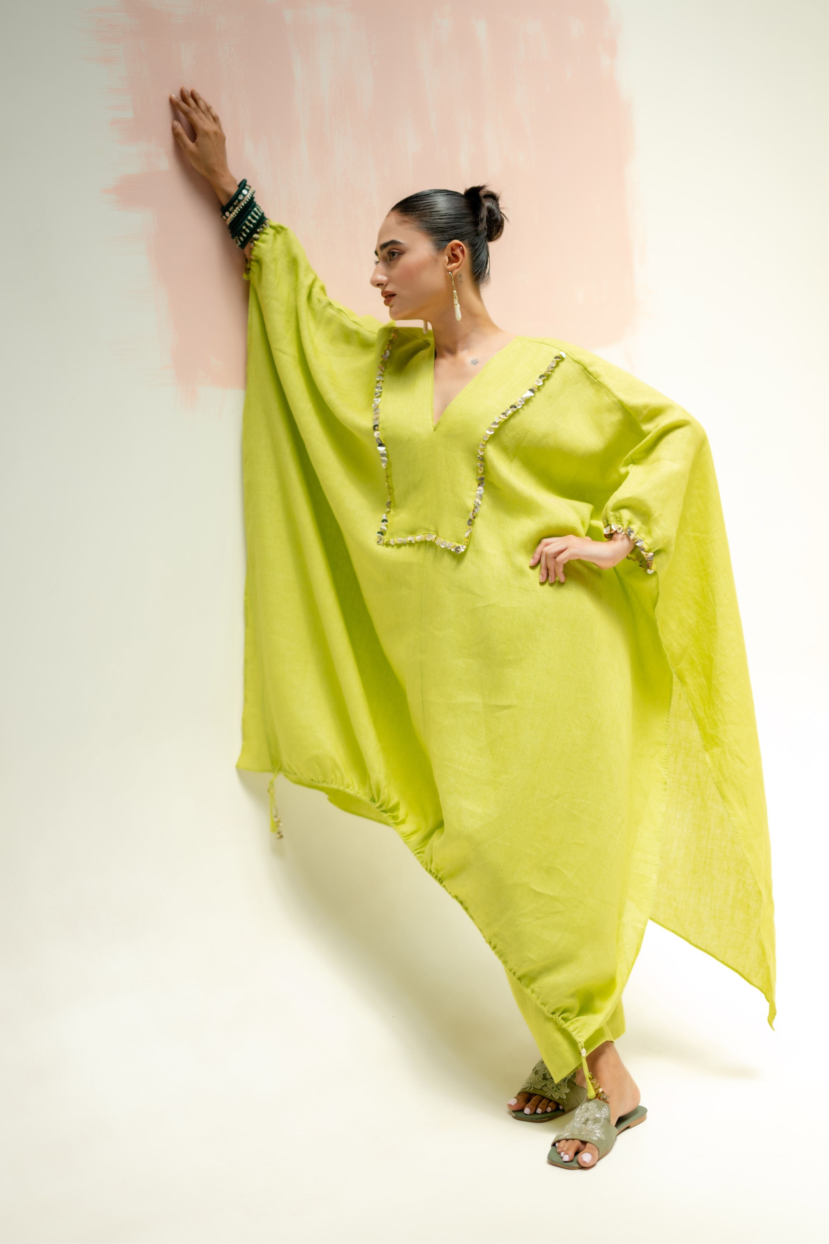 The Sublime Neon Kaftan Kurta Set features a best-selling free-fall silhouette, offering ultimate comfort and style. With minimal hand embroidery that enhances the design, this kaftan exudes effortless elegance. Paired with slim pants.