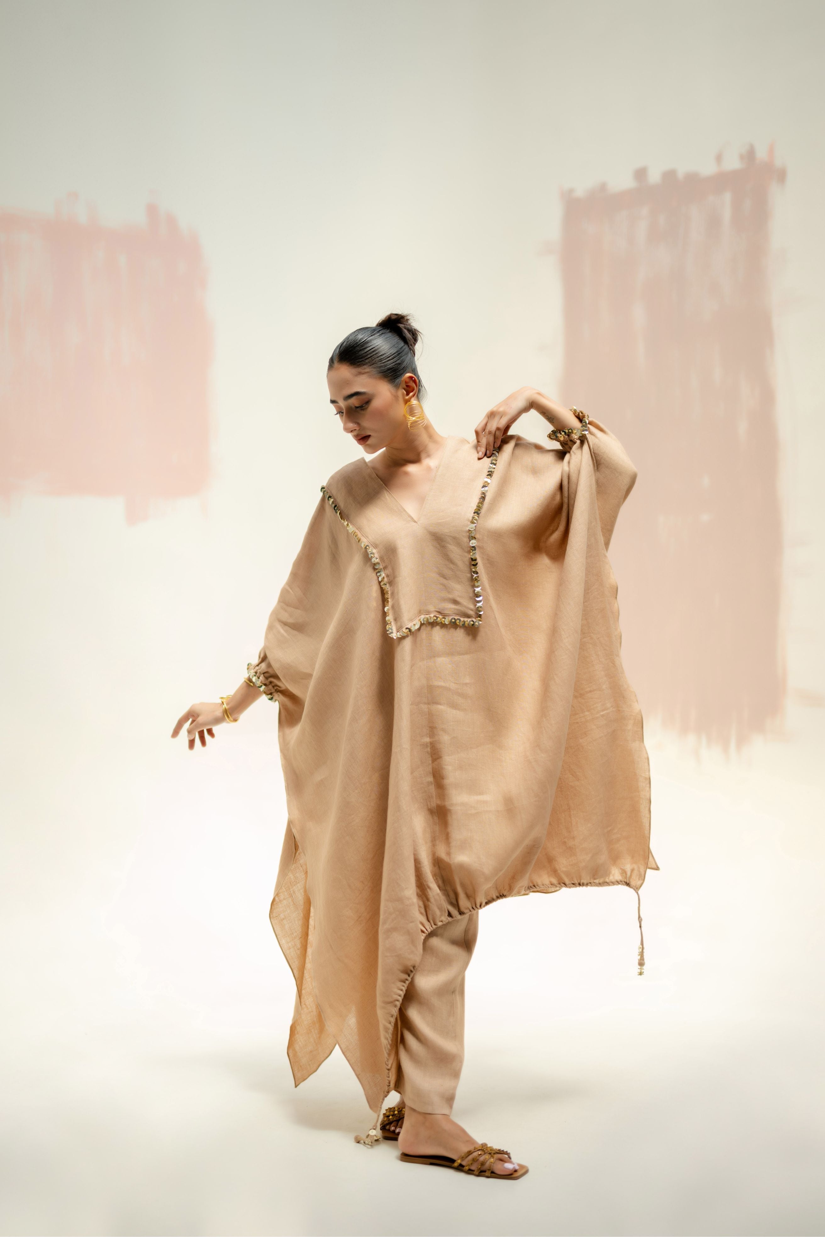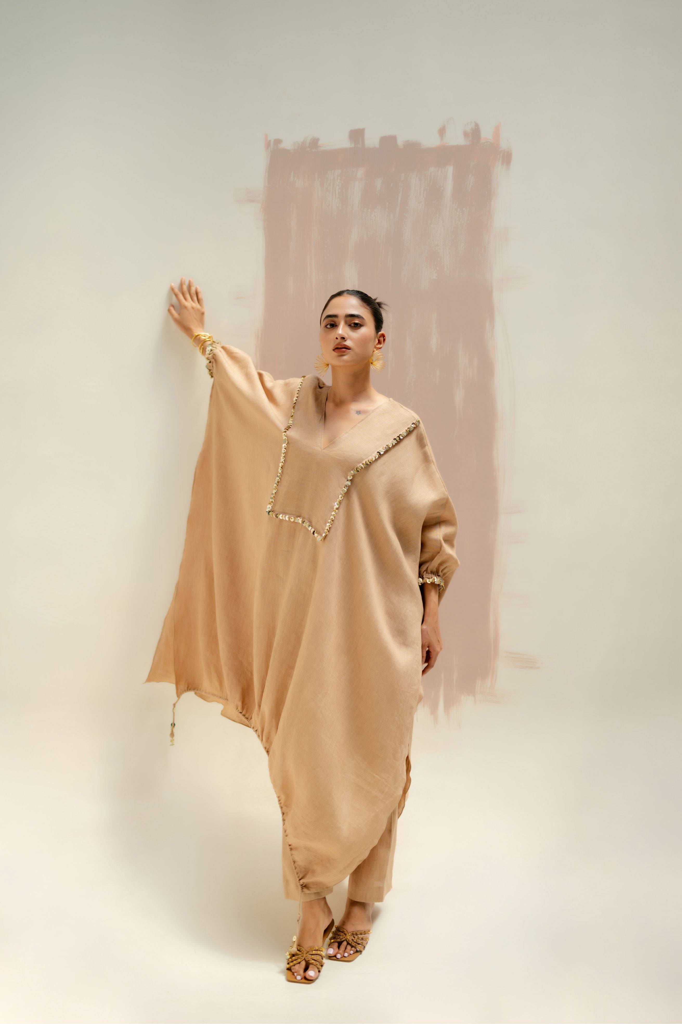 The Camel Colour Kaftan Kurta Set features a best-selling free-fall silhouette for ultimate comfort and style. With minimal hand embroidery, this kaftan exudes effortless elegance, paired with slim linen pants.