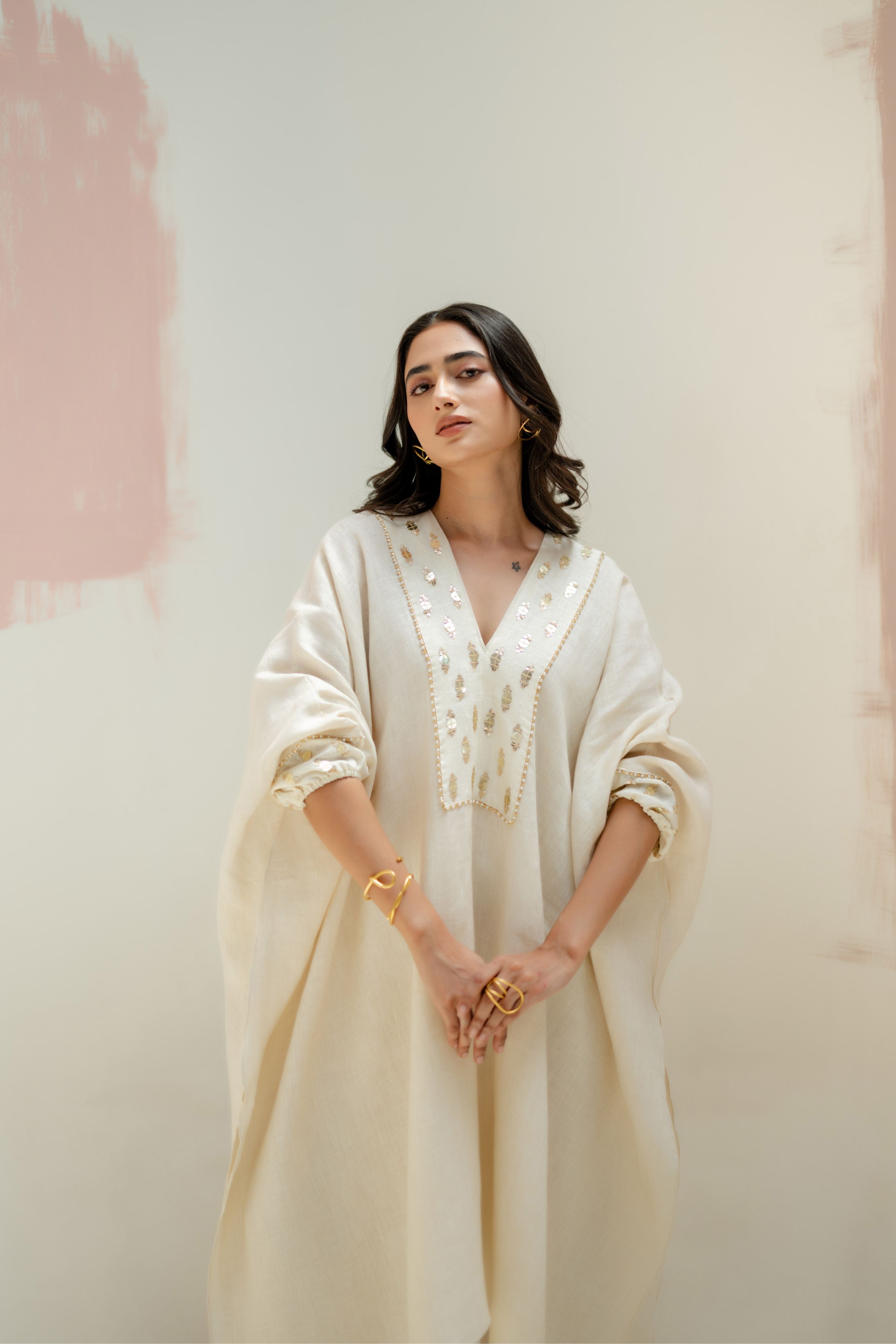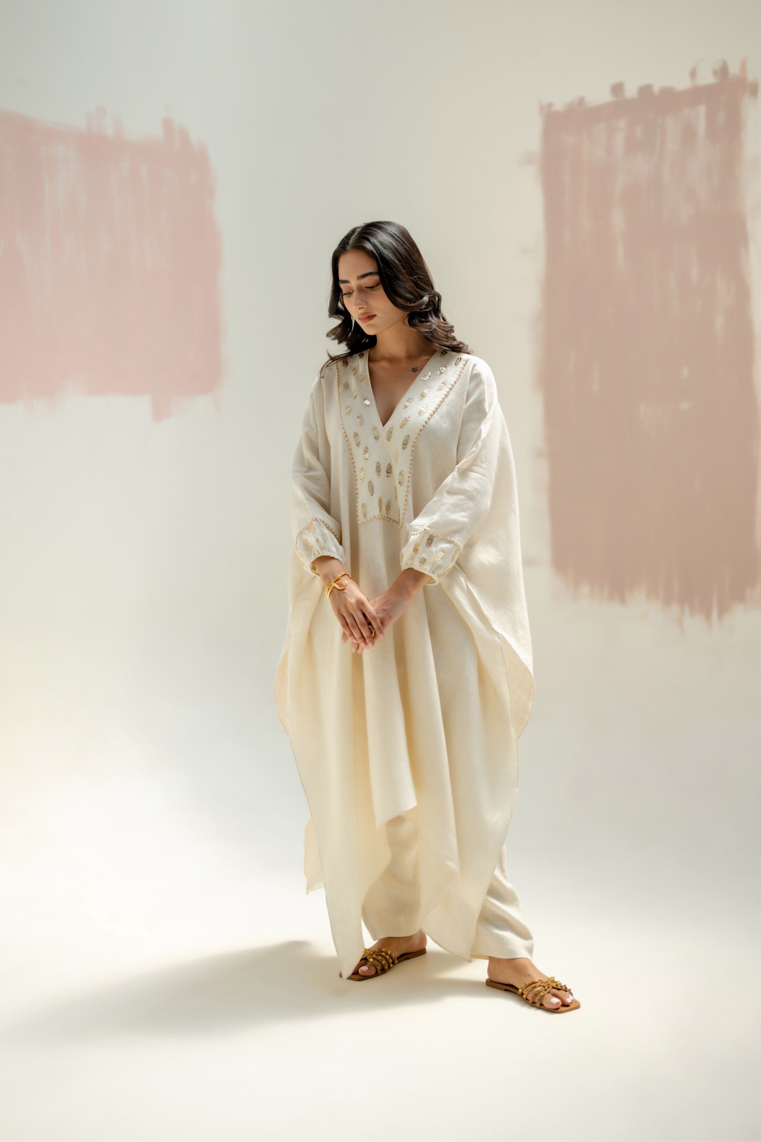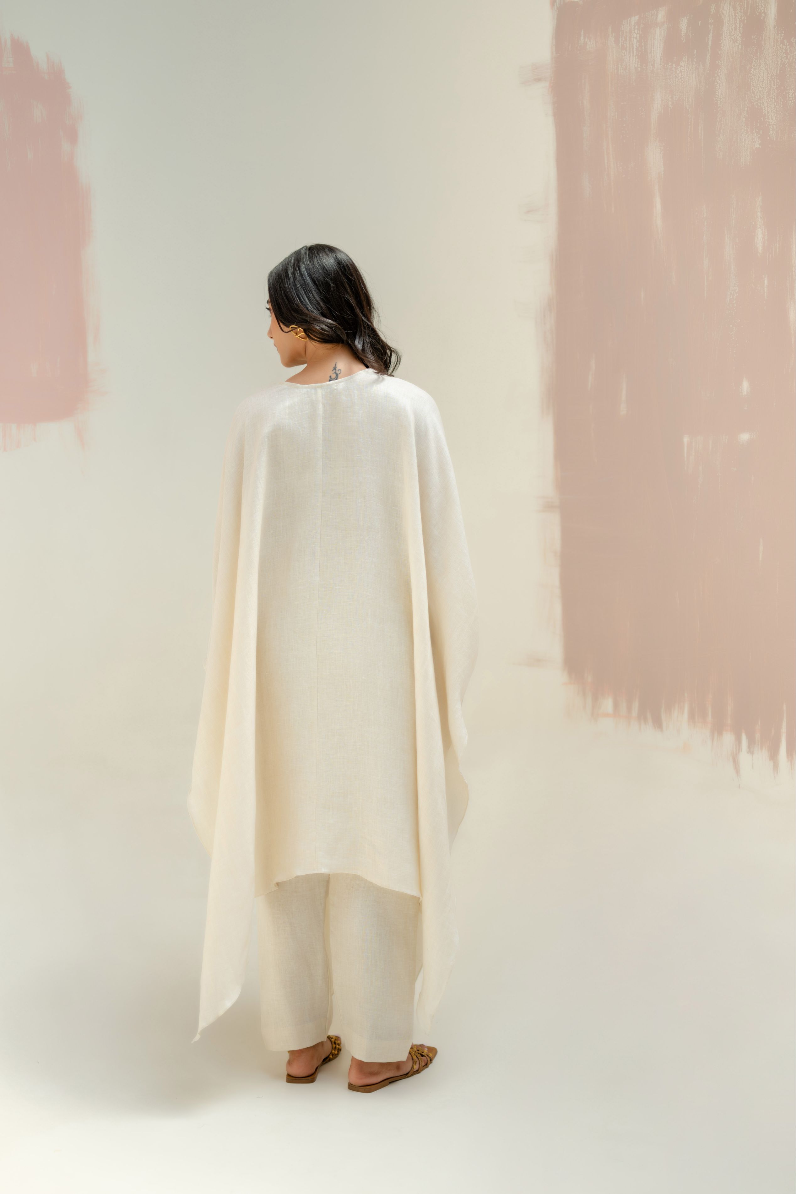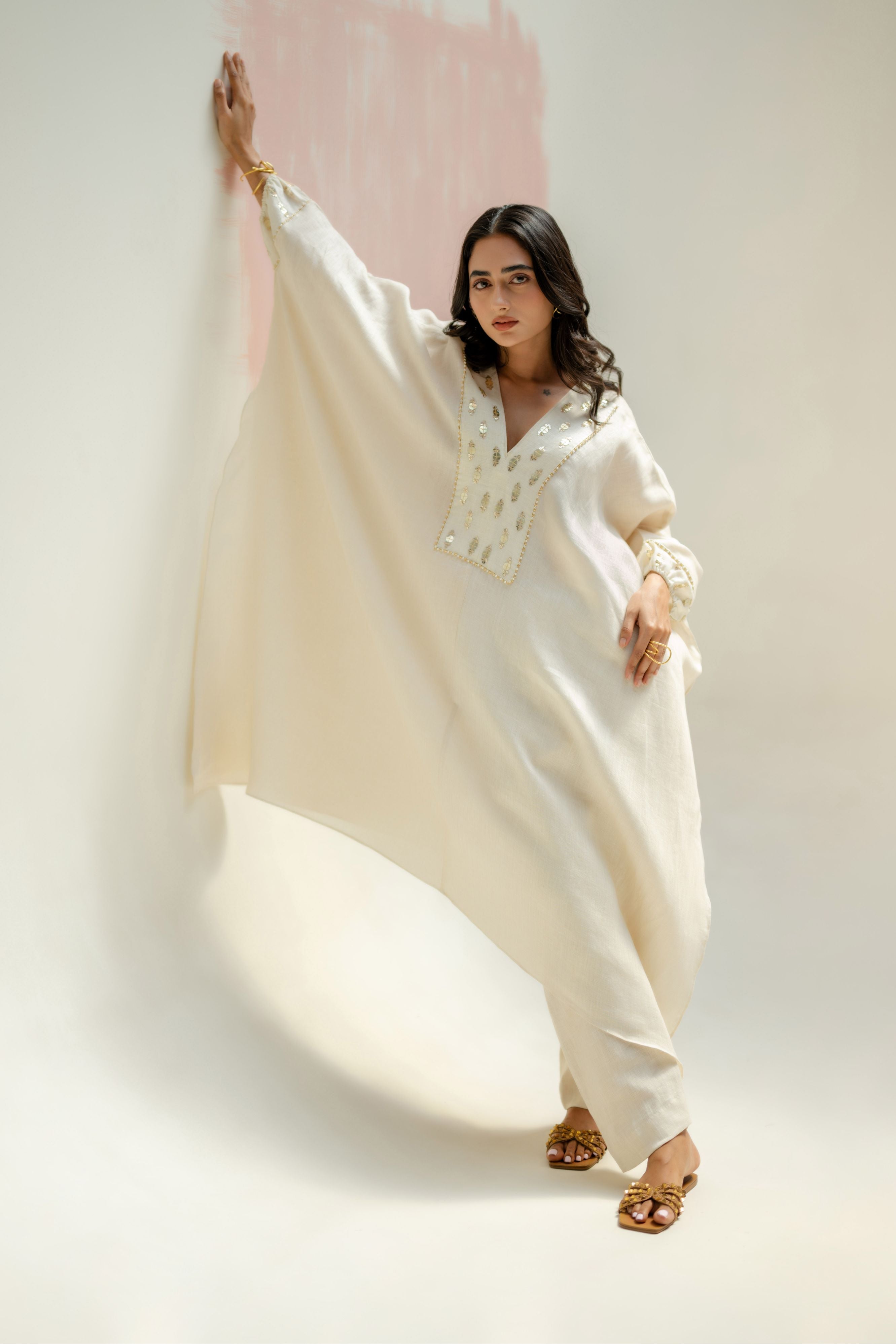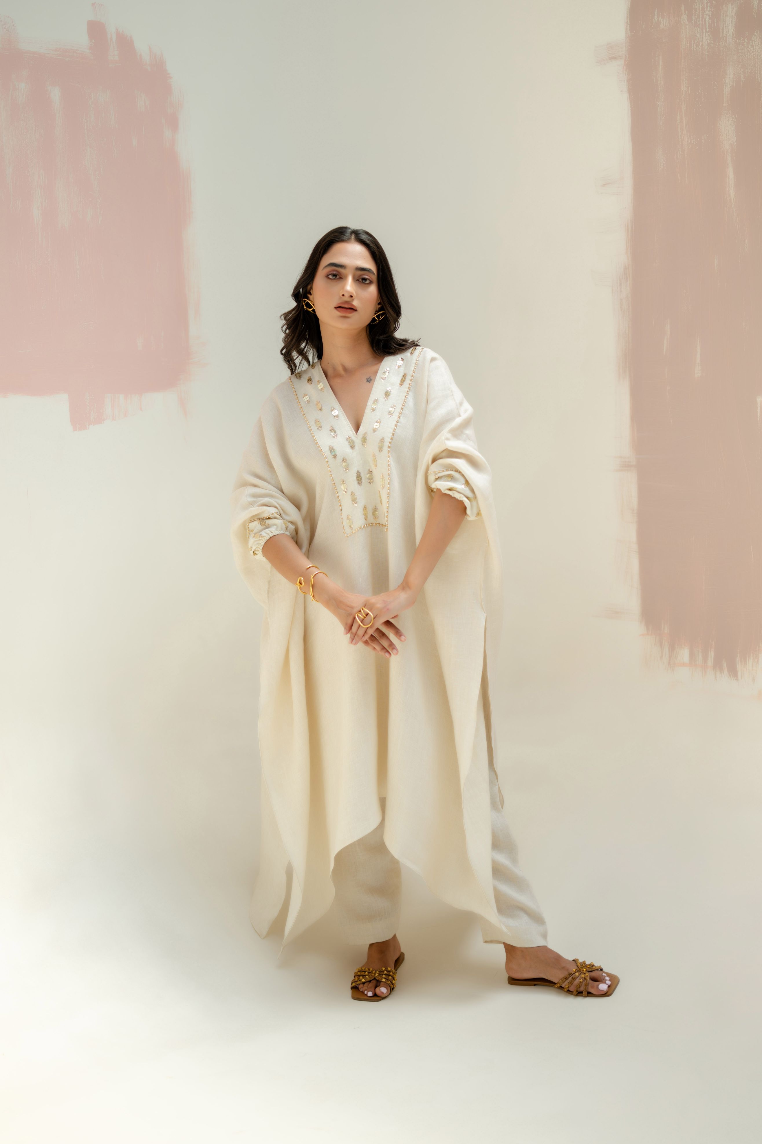 Natural White Linen Kaftan Kurta Set is a Best-Selling Free-Fall Silhouette.The V-neckline and hand-embroidered cuffs add intricate detailing, while the slim linen pants create a sleek look. Perfect for those seeking effortless style and comfort.