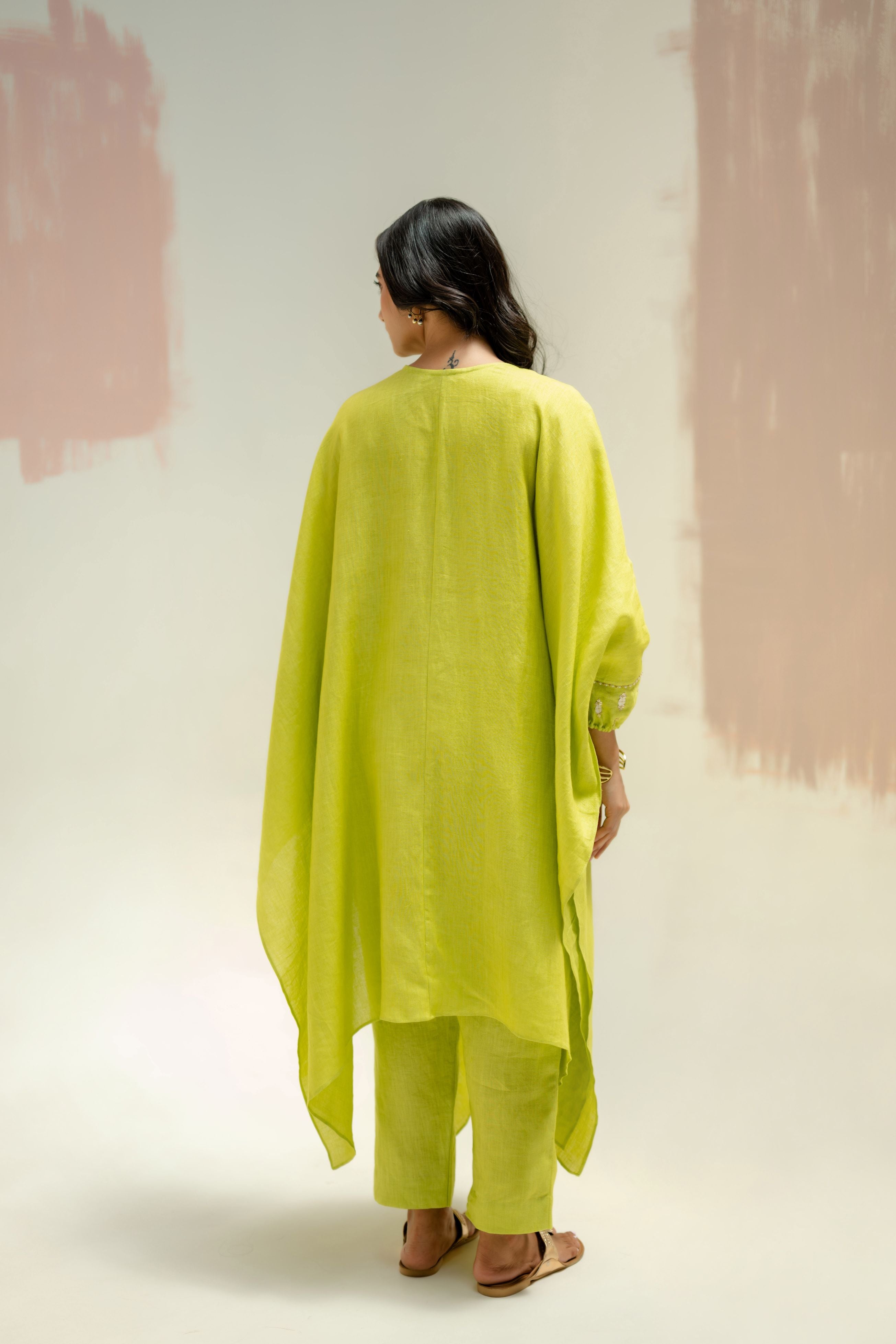Sublime Kaftan Kurta Set is a Best-Selling Free-Fall Silhouette.The V-neckline and hand-embroidered cuffs add intricate detailing, while the slim linen pants create a sleek look. Perfect for those seeking effortless style and comfort.