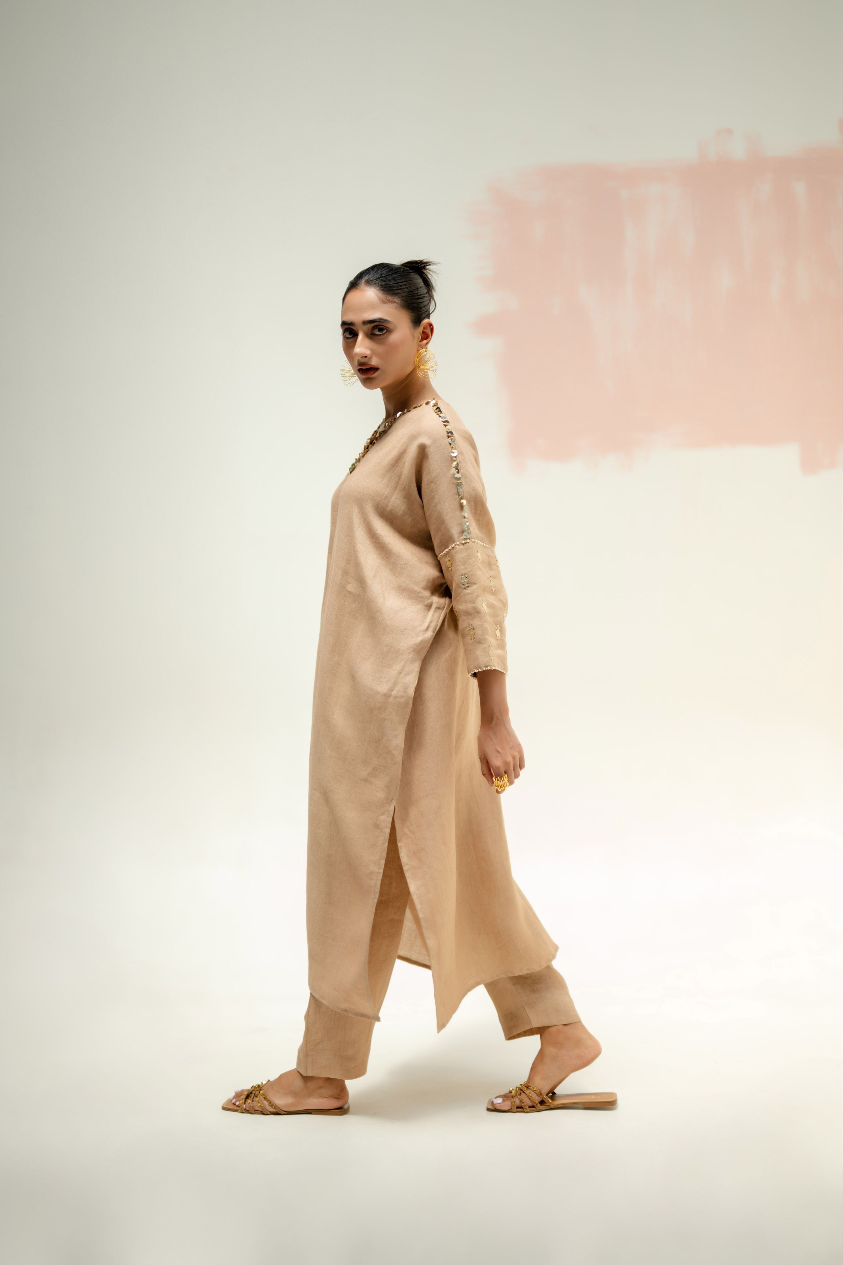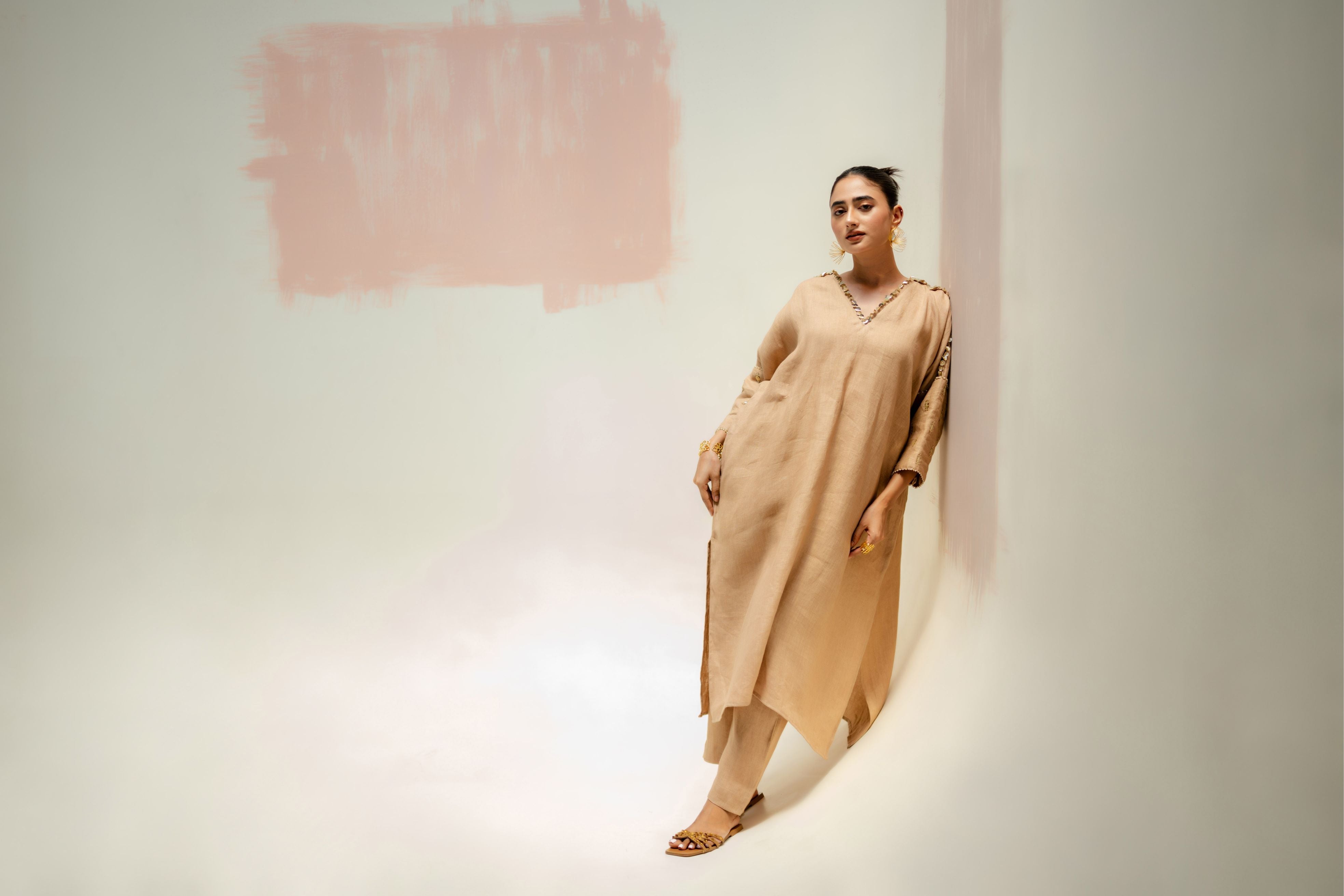 Made from 100% linen, this camel-colour anti-fit kurta set combines style and comfort. Featuring hand-embroidered cuffs, slim linen pants, and functional pockets, it offers elegance and practicality in one.