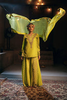 Featuring Kurti Top & Sharara Set with phool appliquéd panels ,designed to combine traditional charm with contemporary elegance. The structured kurti top is adorned with light gold appliqué, while the flowy sharara adds movement and grace. The set is completed with organza silk dupatta in coordinated colour. Perfect for weddings, festive occasions, and pre-wedding celebrations. Model wears size S.